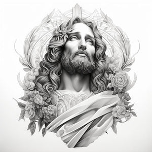 Detailed graphite tattoo of Jesus with Victorian flair