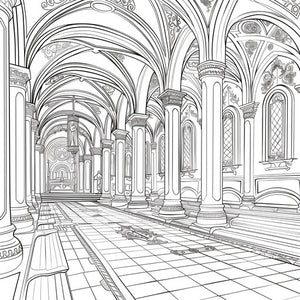#churchinterior #medievalarches #colouringbook #ancientarchitecture #stonecolumns #colorfulstainedglass #decorativedetail #coloringpage #architecturalbeauty #religiousart