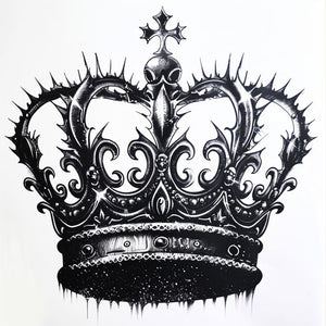 Intricate king crown tattoo in black ink on pure white