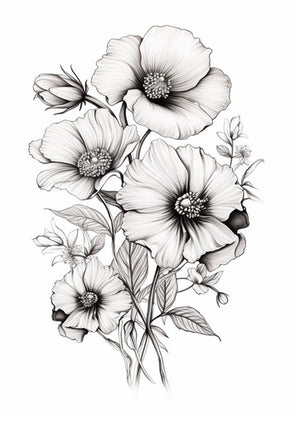 Black and white flower design, pseudo-realistic style, engraved