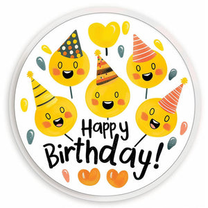 #sticker #white background #circle sticker with yellow smiley faces wearing party hats #Happy Birthday!