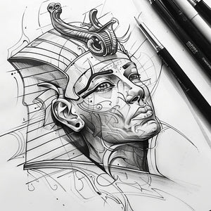 Flat tattoo sketch of a pharaoh with an Art Nouveau twist