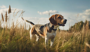 Beagle walking through tall grass with owner in graceful restraint style, light brown and navy, ferrania p30, hard-edged, farm security administration aesthetics, princesscore 12:7