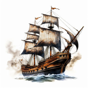 Pirate ship clipart in the style of Chiaroscuro Art, on a white background
