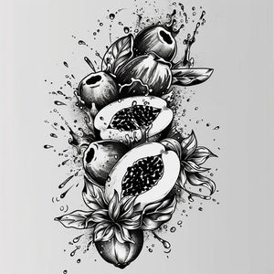 Dynamic sketch of jagua fruit tattoo falling into a splashing pool of water