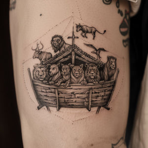 Intricate tattoo of Noah's Ark with various animals in bold black