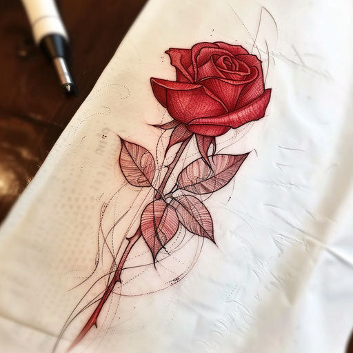 Delicate and intricate tattoo sketch of a red rose with fine line art and soft shading