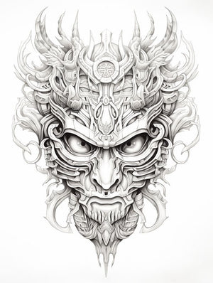 #JapaneseMask #BlackAndWhiteIllustration #DetailedGraphiteSketches #BalineseArt #MechanicalRealism #AnguraKei #RealisticHyperDetail #DayakArt #NecronomiconIllustrations #JapaneseArt