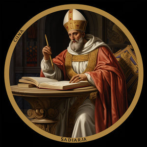 Round sticker of St. Abbate Claudius in avocadopunk style