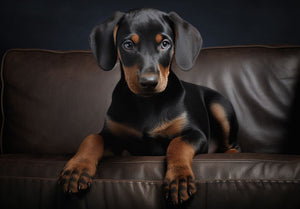 Black and tan doberman puppy standing on a sofa