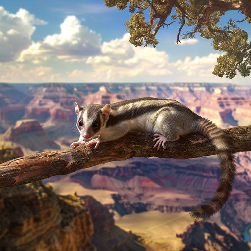 A sugar glider basking in the sun on a branch overlooking the Grand Canyon