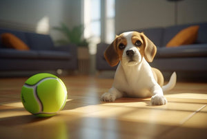 beagle with tennis ball playing in the house
